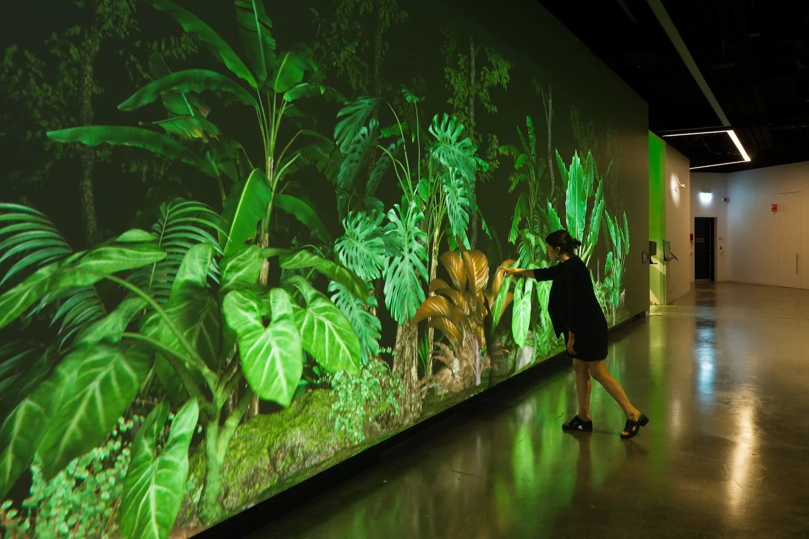 Step into the lush greenery of this forest where the wall is a canvas for the jungle to drip, seep and thrive with life. Yet as you get closer, the tangled growth will react to your presence. How does this make you feel? As a vibrant scene unfolds, reflect on the impact humans have on the natural environment. In this transient, green paradise you may want to tread softly. Beautiful environments are captivating – but maybe we should be keeping more of a distance for nature’s own good.