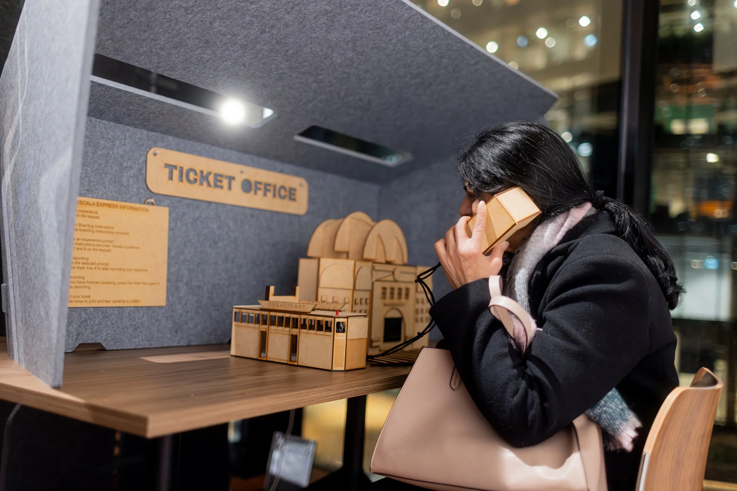 NISCALA explores the interaction between human emotions, memories and interactive technologies. Our focus is to find an equilibrium between the emotional connection humans have with technology, as well as provide users with a memory to take home with them. By reimagining the phone, and designing our installation based on transport, we have created 9 different prompts for people to interact with. NISCALA transports you through time and encourages participants to record their answers through the phone and allow our prototype to print off a ticket with their response as a memory. This is done through a microphone and speaker that converts the speech to text and sends the text file to a thermal printer for the participants to either take home their memory or pin it up on NISCALA station.